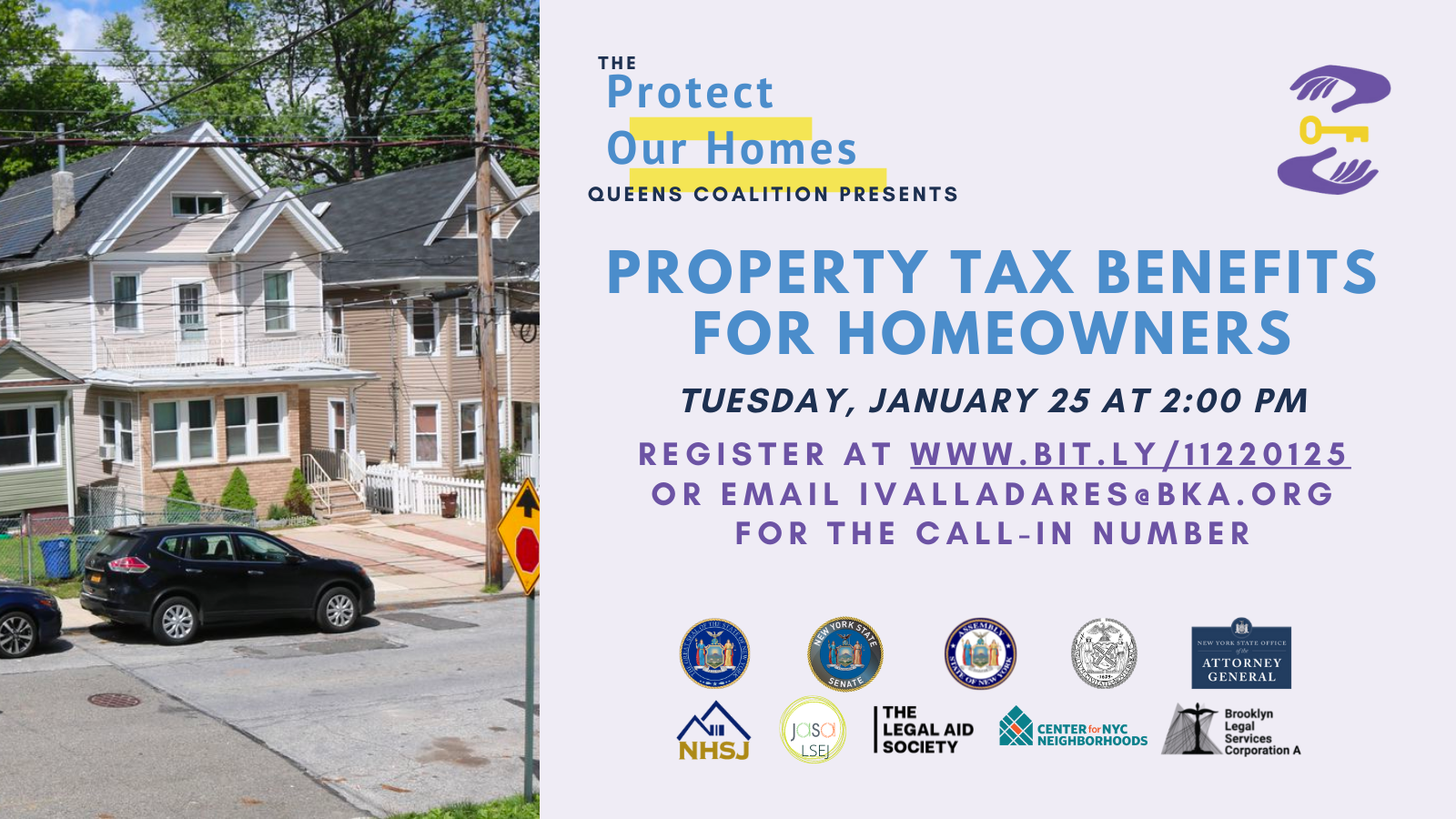 Homeowners in New York City and New York State can find relief through property tax exemptions, abatements, and credits. Join us for this webinar hosted by the Protect Our Homes Queens Coalition, featuring the NYC Department of Finance, and with sponsorship support from NYC Council Speaker Adrienne Adams, State Senator James Sanders Jr., State Senator Leroy Comrie, State Assembly Member Alicia Hyndman, State Assembly Member Clyde Vanel, State Assembly Member Khaleel Anderson, Council Member Selvena Brooks-Powers, and Council Member Nantasha Williams.