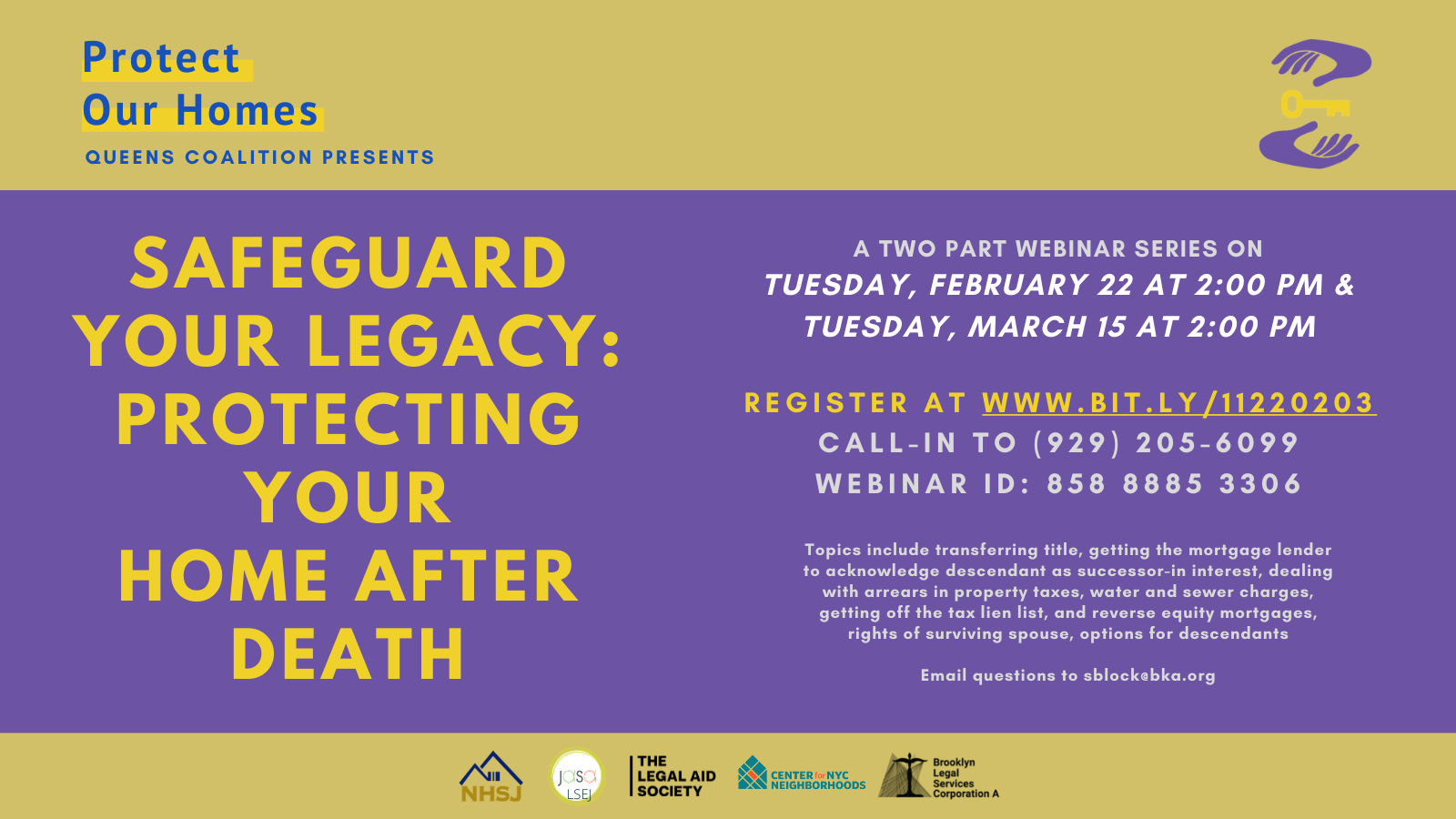 Late with your mortgage? Don't lose your home and don't get fooled by scams! Join our webinar with NHS Brooklyn tonight at 6PM to learn about the Foreclosure Abuse Prevention Act, what to do if you're late on your mortgage, and more tips to protect your home. Click here to sign up. Register Here